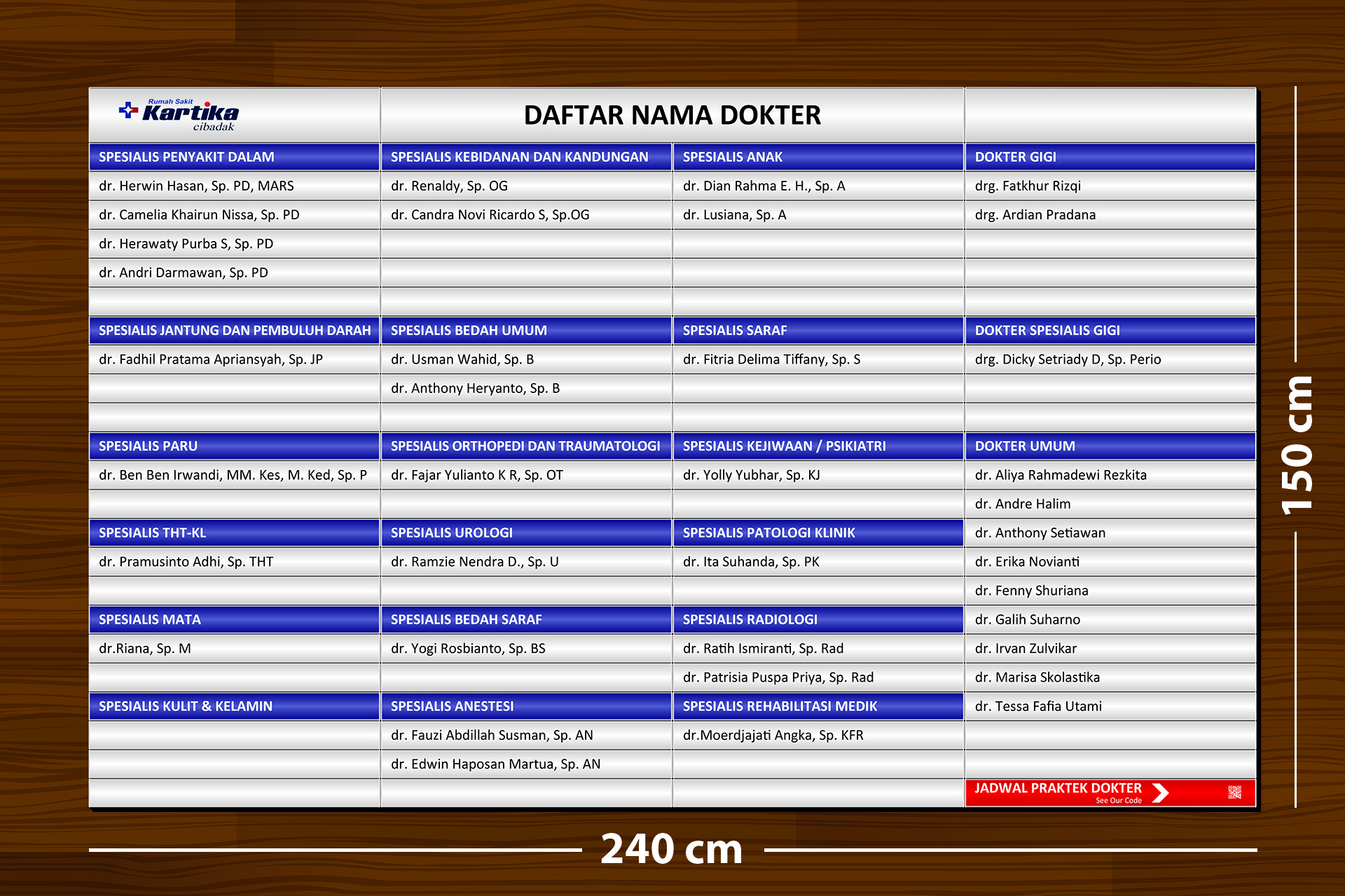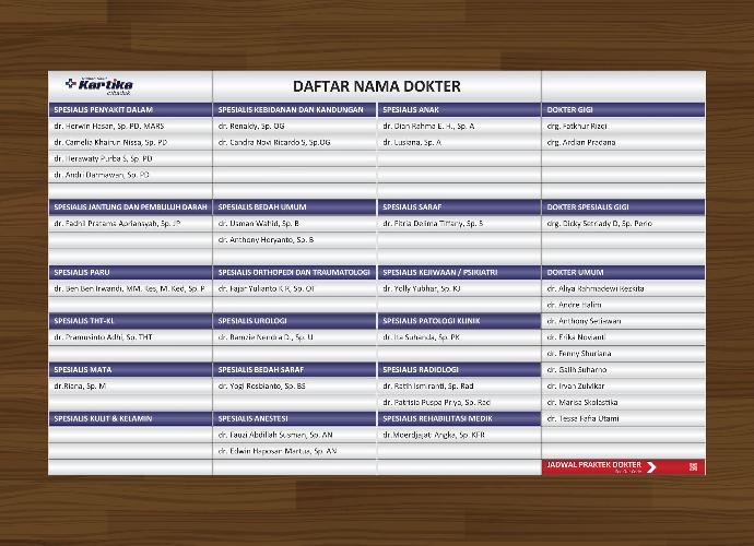Papan Nama Daftar Dokter yang konfigurasinya bisa disesuaikan dengan kebutuhan. Mudah untuk mengganti Gambar / cetakan salah satu "Nama dokter" tanpa harus mengganti seluruhnya.