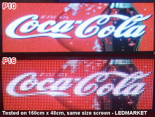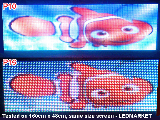 Kami sudah memberikan perbedaan antara P 10, P16 dan P25 di dalam gambar di atas, dimana Semakin rapatnya Pixel Pitch mengakibatkan jumlah lampu LED akan semakin banyak, sehingga membuat harga dari LED Display atau Videotron akan semakin mahal, tapi membuat LED Display atau Videotron semakin nyaman dilihat oleh mata kita. Kami juga akan menunjukan perbedaan antara P10 dan P 16 jika rangkai menjadi 1 layar utuh, hall ini berkaitan dengan resolusi, yaitu jumlah pixel pitch yang berada pada layar sebuah videotron atau LED Display, yang menunjukkan tingkat kepadatan dari suatu layar. Semakin tinggi resolusi maka semakin halus juga gambar yang dihasilkan.