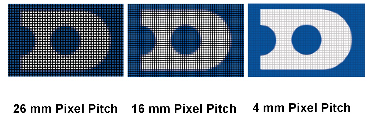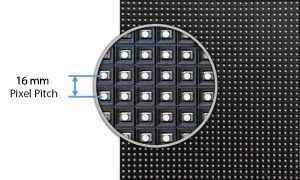 Selanjutnya yaitu pengertian Pixel Pitch adalah jarak dari satu lampu ke lampu yang berikutnya, memiliki satuan Milimeter. Misalkan Pixel Pitch 10, artinya adalah jarak dari satu lampu ke lampu yang berikutnya adalah 10 milimeter, ataupun Pixel Pitch 16 artinya adalah jarak dari satu lampu ke lampu yang berikut adalah 16 milimeter, semakin rapat Pixel Pitch dari videotron tersebut, maka harganya pun semakin mahal, karena akan banyak membutuhkan banyak led di dalamnya ( untuk selanjutnya kata Pixel Pitch kami singkat menjadi huruf P misalkan Pixel Pitch 10 menjadi P 10 ) . Berikut kami sertakan contoh gambar P 10, P16 dan P 25.