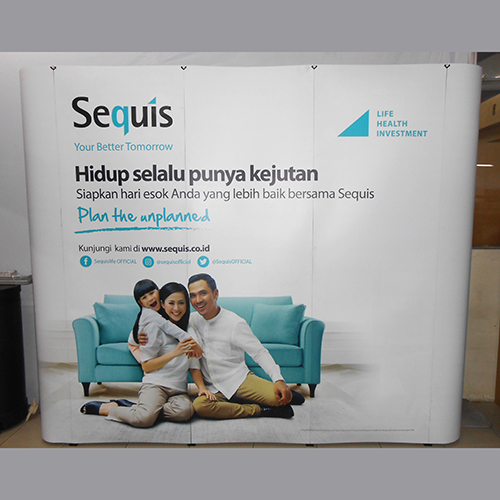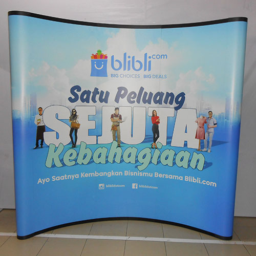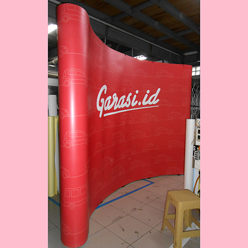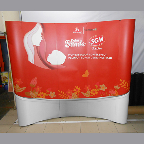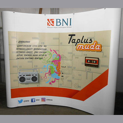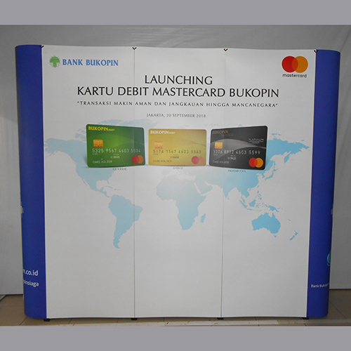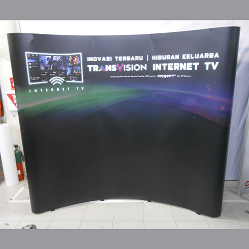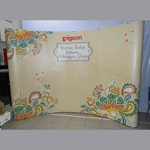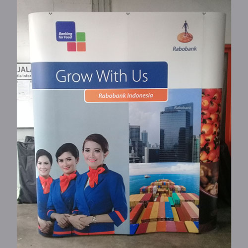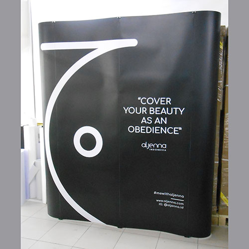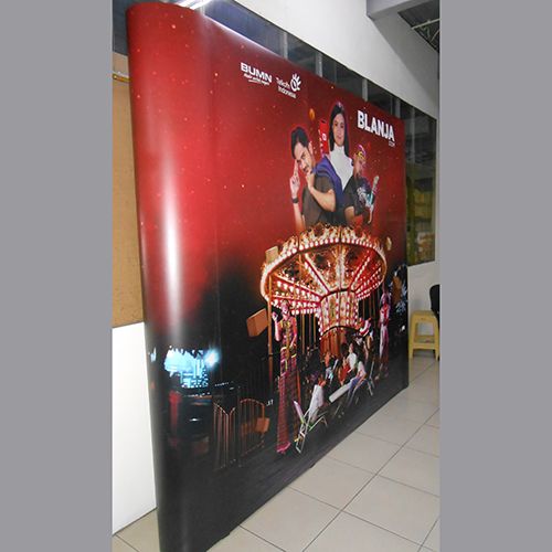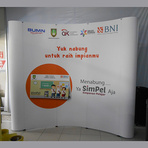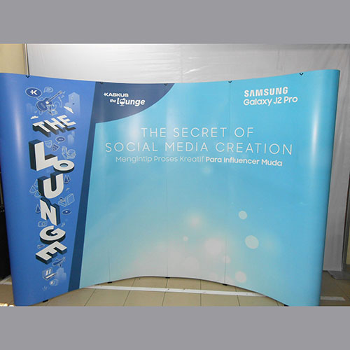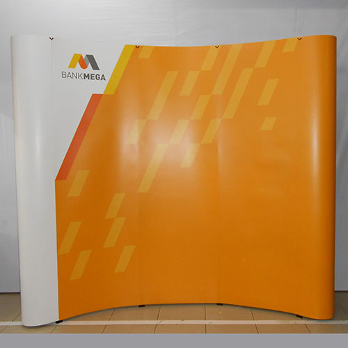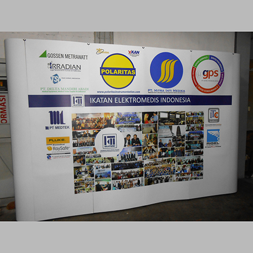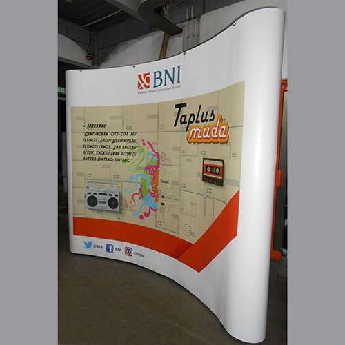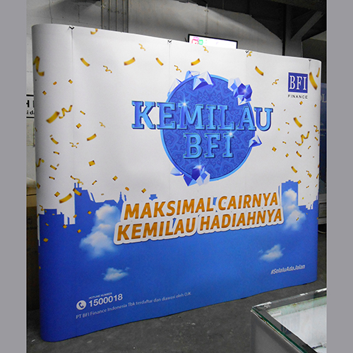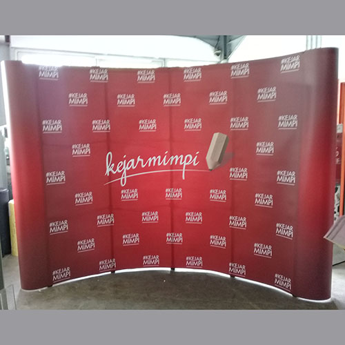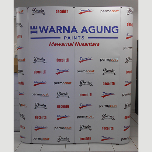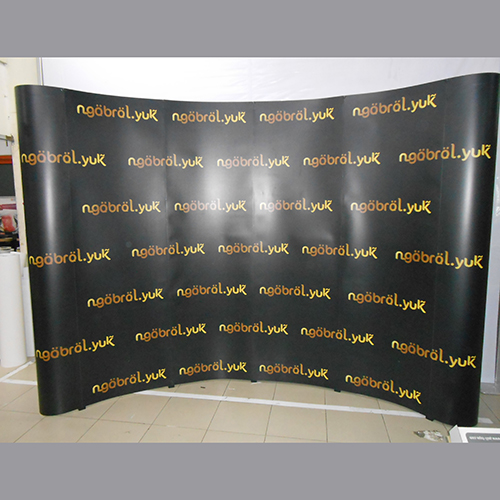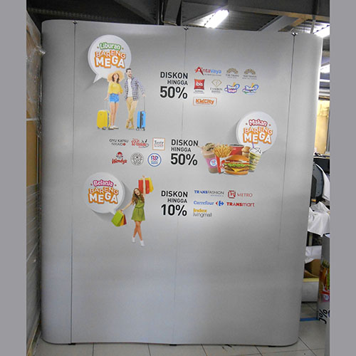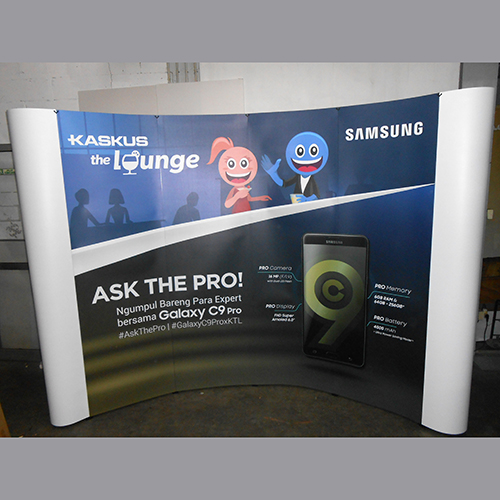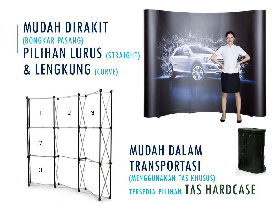 Pop Up Backwall merupakan perangkat promosi untuk menampilkan visual/grafis dalam ukuran besar (backdrop). Pop Up backwall menggunakan kerangka modul besi yang kokoh Semua model display Pop Up menggunakan sistem penahan dengan pin, palang dan pengikat magnet. Banner/visual yang ingin Anda tampilkan pun tak terganggu dan akan menjadi fokus utama perhatian. Setiap pembelian backwall Pop Up 3x3 Flat atau Curve Anda akan mendapatkan. Rangka Backwall - Magnetic bars - Soft case - 2 lampu sorot spotlight - Supporting feet (khusus untuk Pop Up Backwall Flat)