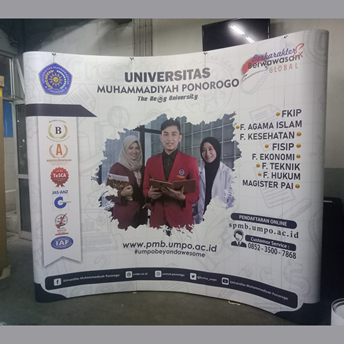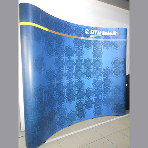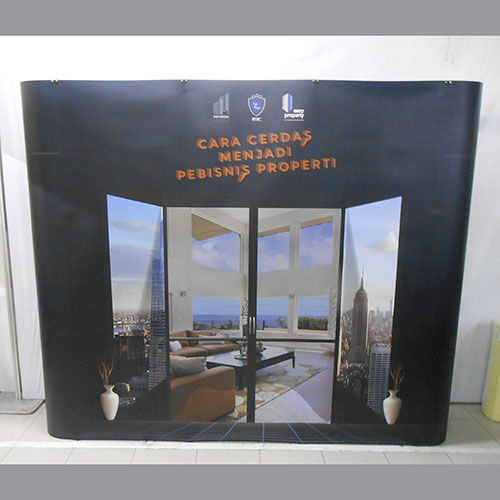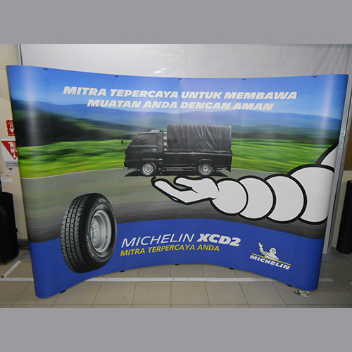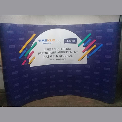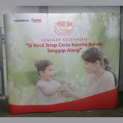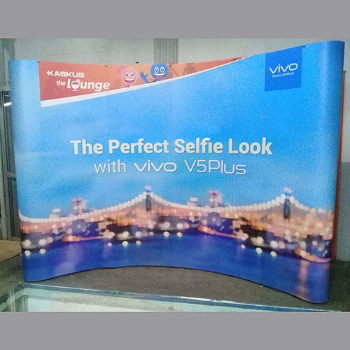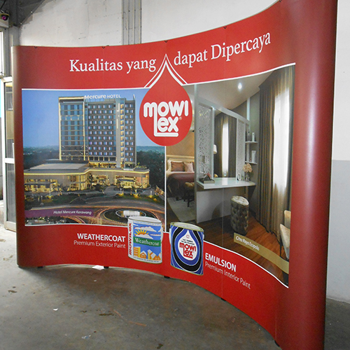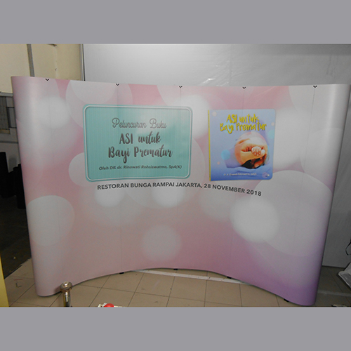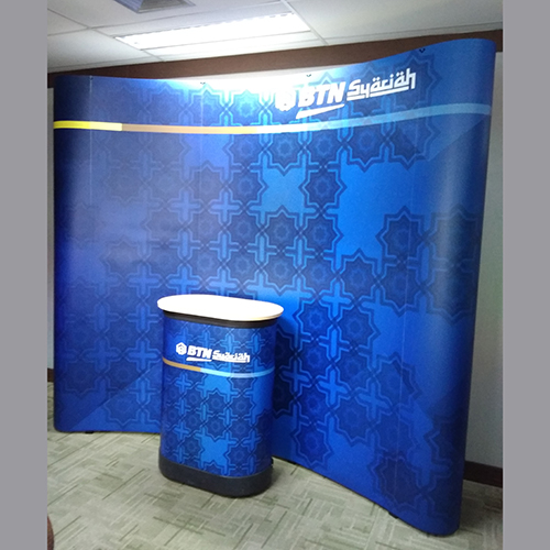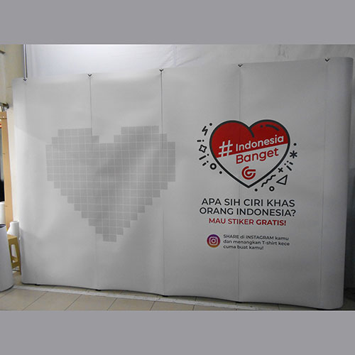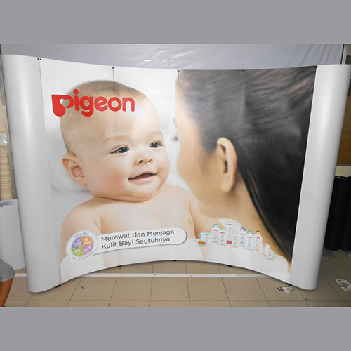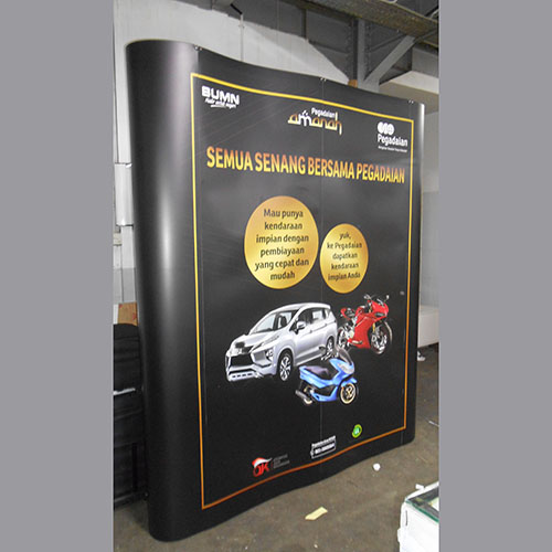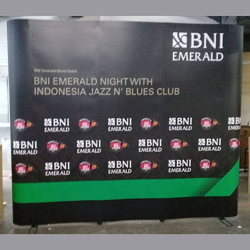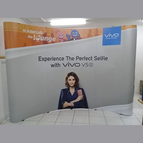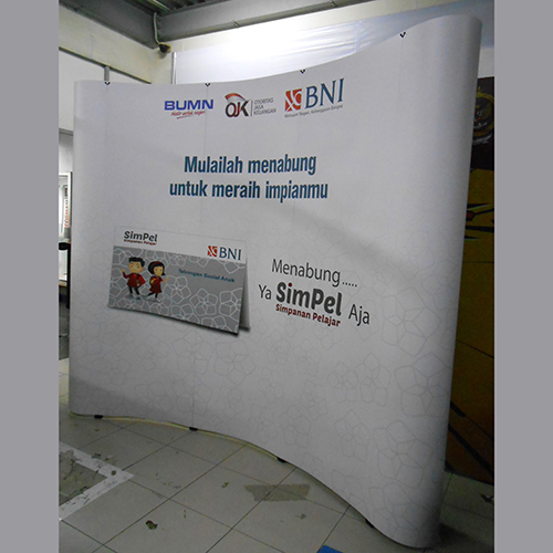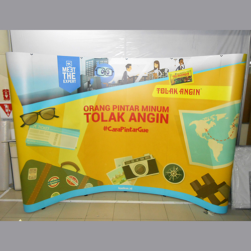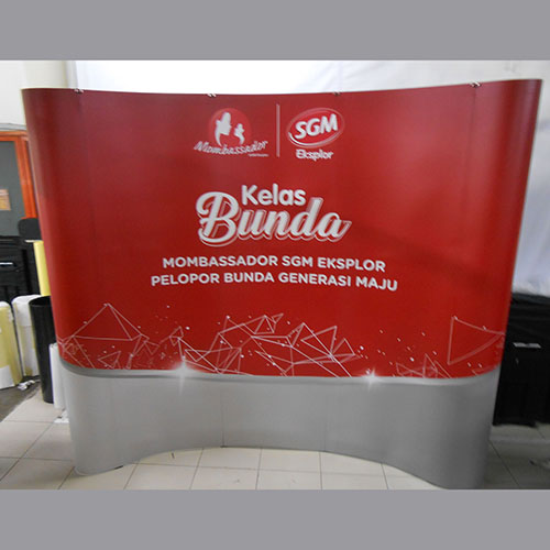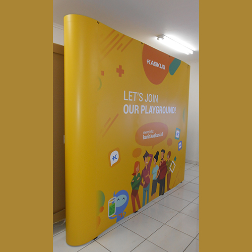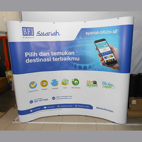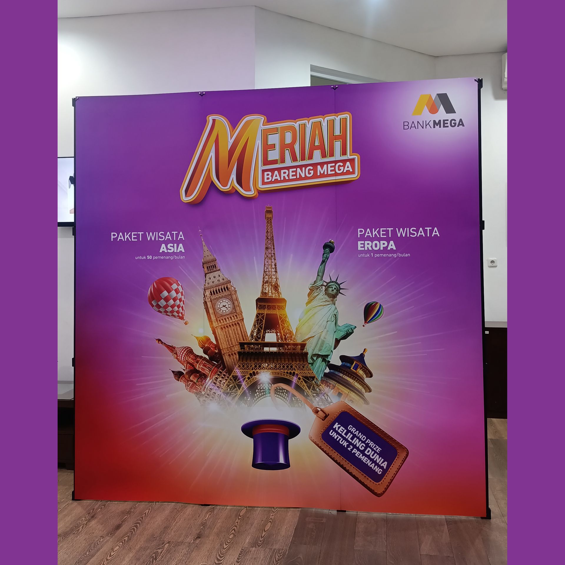 Pop Up Backwall merupakan perangkat promosi untuk menampilkan visual/grafis dalam ukuran besar (backdrop). Pop Up backwall menggunakan kerangka modul besi yang kokoh Semua model display Pop Up menggunakan sistem penahan dengan pin, palang dan pengikat magnet. Banner/visual yang ingin Anda tampilkan pun tak terganggu dan akan menjadi fokus utama perhatian. Setiap pembelian backwall Pop Up 3x3 Flat atau Curve Anda akan mendapatkan. Rangka Backwall - Magnetic bars - Soft case - 2 lampu sorot spotlight - Supporting feet (khusus untuk Pop Up Backwall Flat)