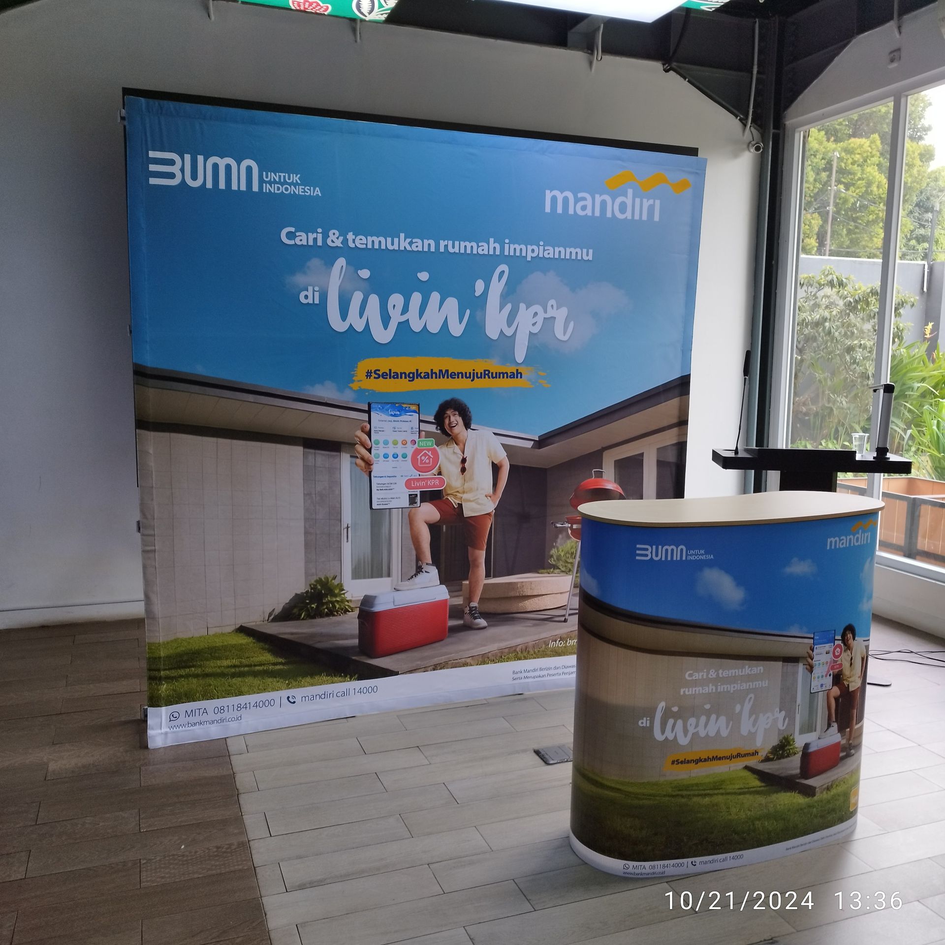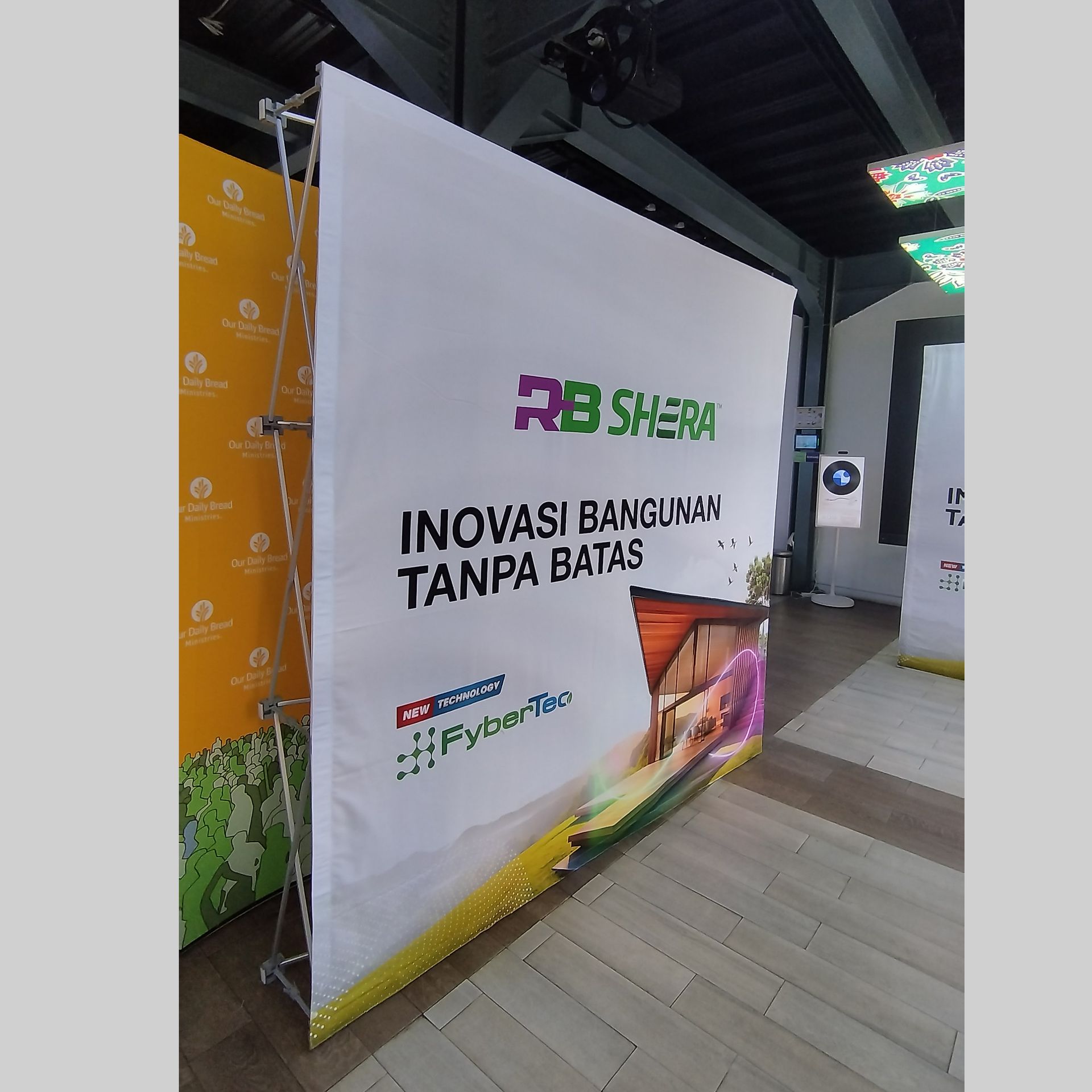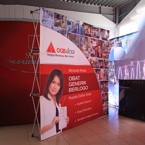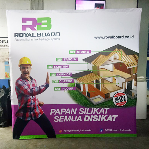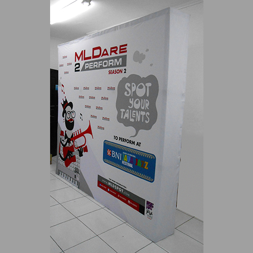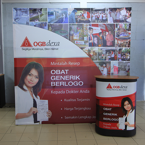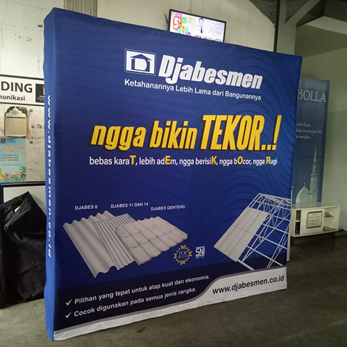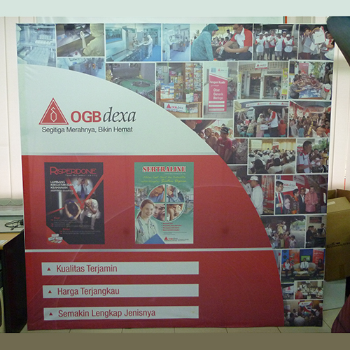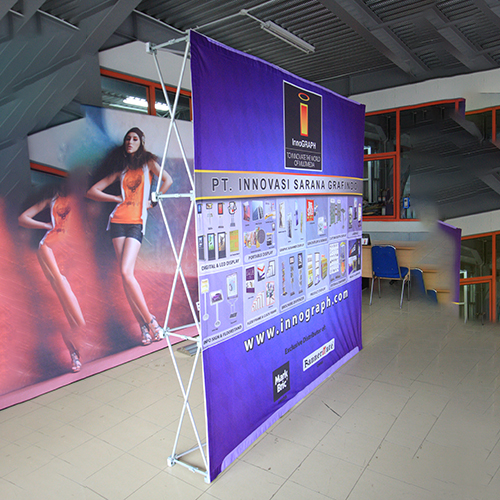 Pop Up Fabric Display merupakan perangkat portable display backwall dengan system collapsible untuk menampilkan graphic dalam ukuran besar (225 x 225 cm) yang di cetak pada media fabric textile sehingga graphic dapat ditampilkan secara penuh, rapi, dan tidak terpotong. Pop Up Fabric terbuat dari alumunium sehingga kokoh dan tak gampang jatuh selain itu Pop Up Fabric menggunakan sistem collapsible maka dapat dipasang dan dipindahkan dengan mudah tanpa perlu alat berat.