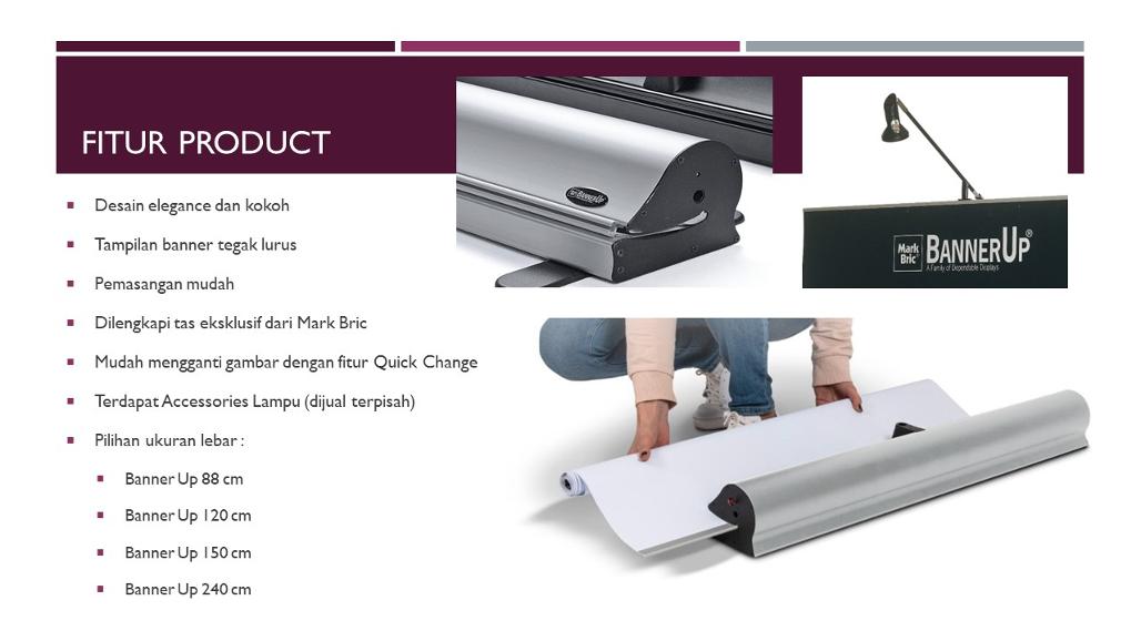 Merupakan produk Rolling Banner dengan kualitas terbaik yang ada di pasaran saat ini. Dibuat oleh Mark Bric Swedia dengan Material Alumunium yang kuat dan kokoh.