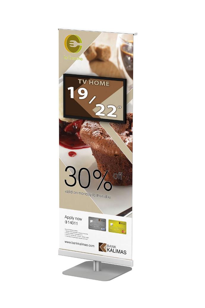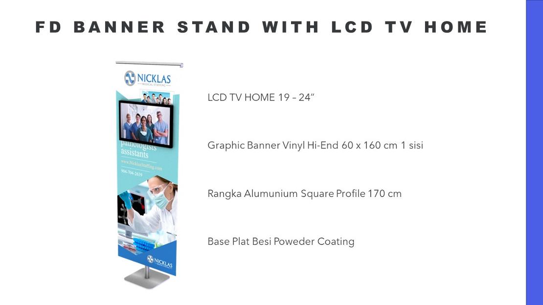 FD Banner Stand ini memiliki fitur serupa dengan X-Banner dan Roll Up. Akan tetapi mempunyai ciri khas tersendiri dengan menggunakan Flexi Display System Alumunium Extrution Profile (Rangka Alumunium yang Kuat, Kokoh dan Anti karat) sehingga menjadikan produk ini tahan lama
