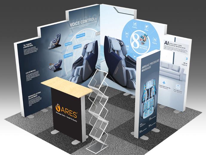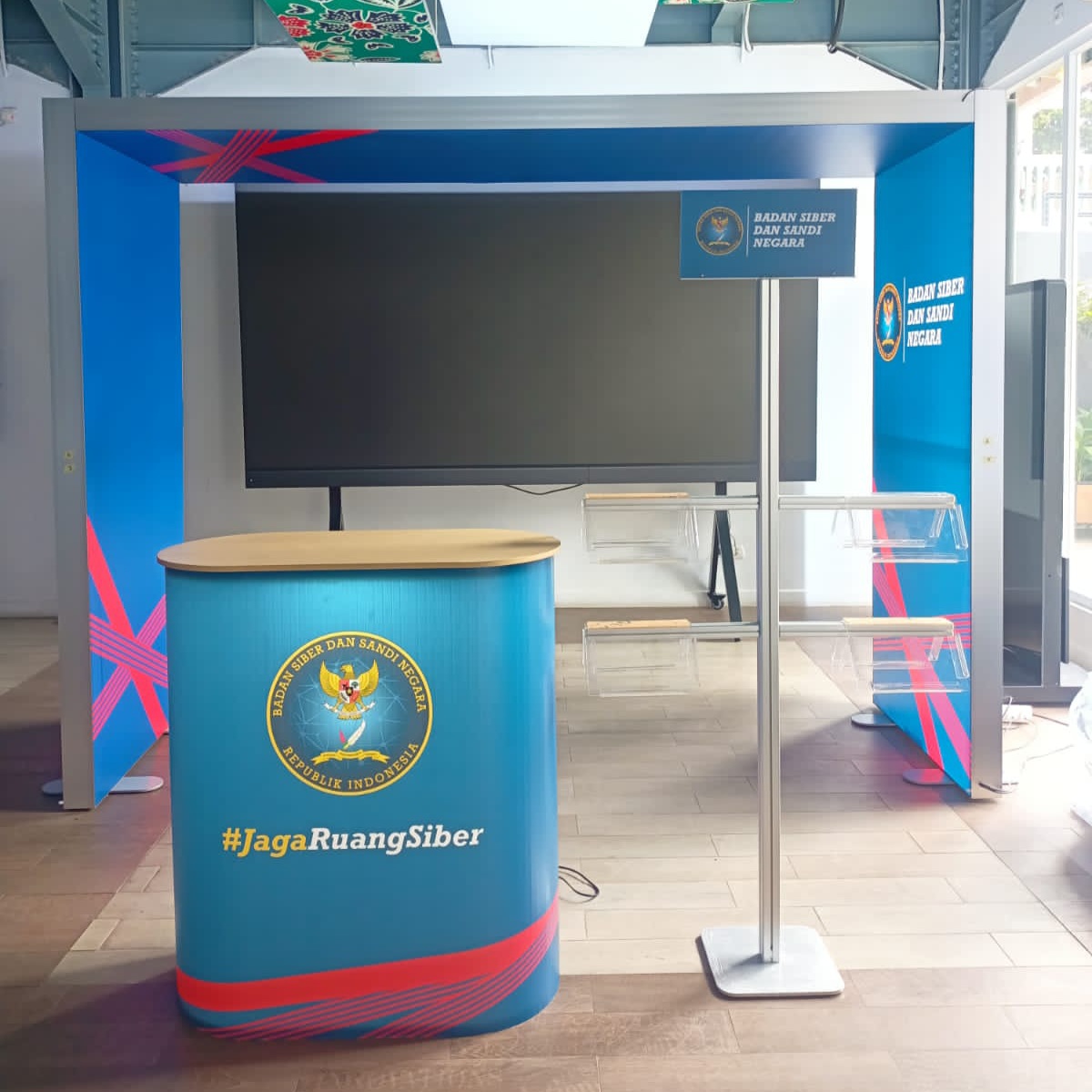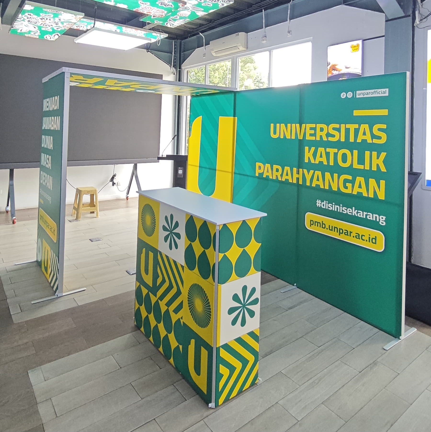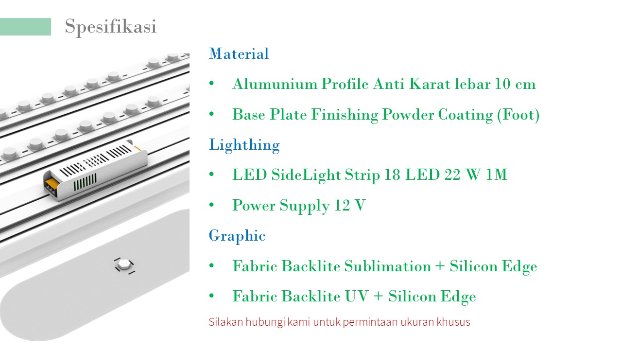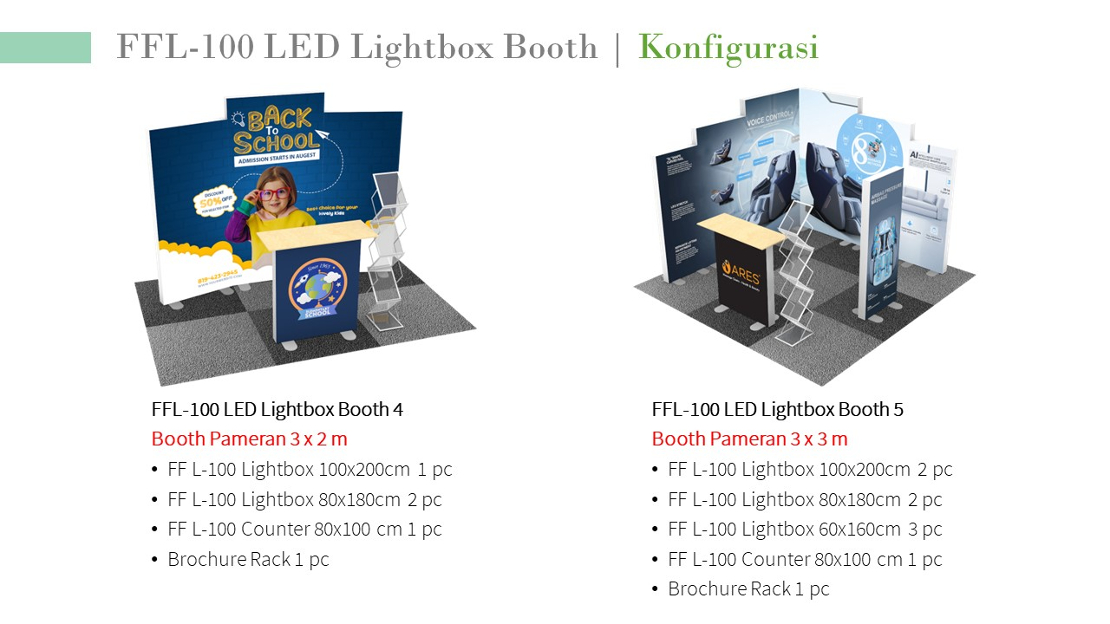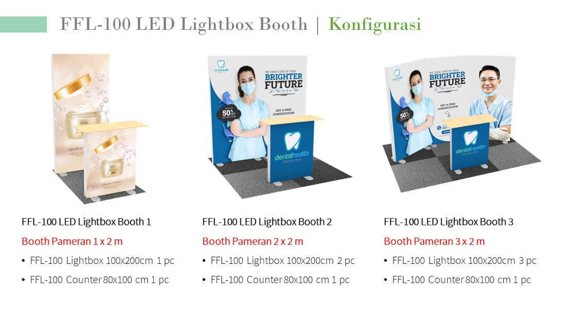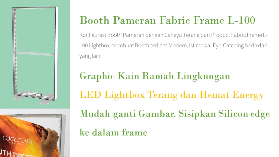 Display Produk untuk Booth Pameran yang terbuat dari Fabric Frame L-100 2 Side LED-Lightbox. Sehingga Tampilan menjadi lebih menarik perhatian pengunjung yang datang. dengan Graphic Fabric (Kain Textile + Silicon Edge), udah ganti graphic, sisipkan silicon edge ke frame lightbox.