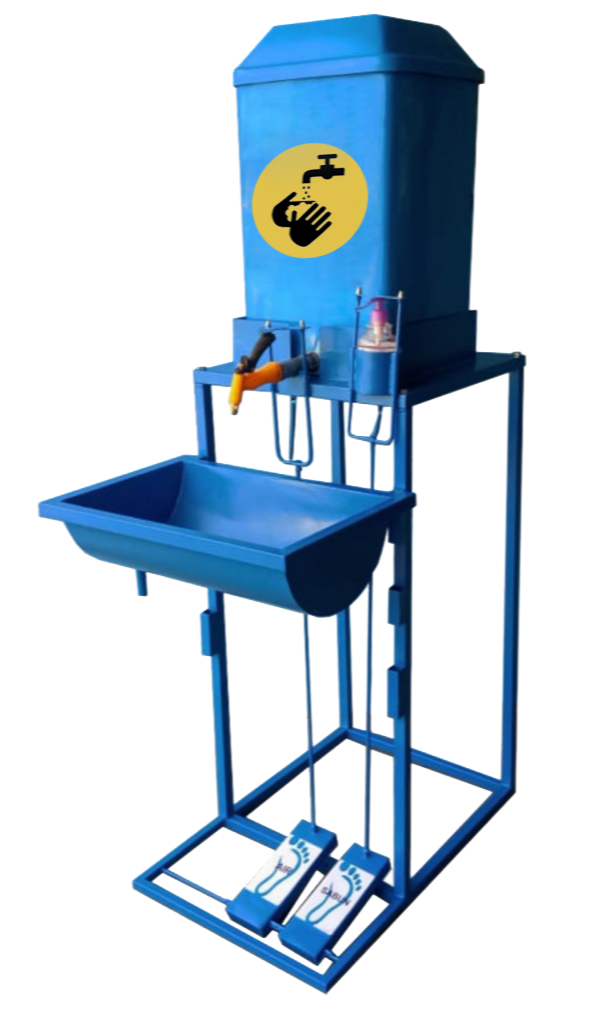 Produk sanitizer dengan sistem Knock Down injakan kaki yg dapat di operasikan tanpa menyentuh apapun (sabun dan kran) dilengkapi dengan pengaturan ketinggian pada bak penampungan dan dilengkapi kapasitas air sebesar 60 liter.