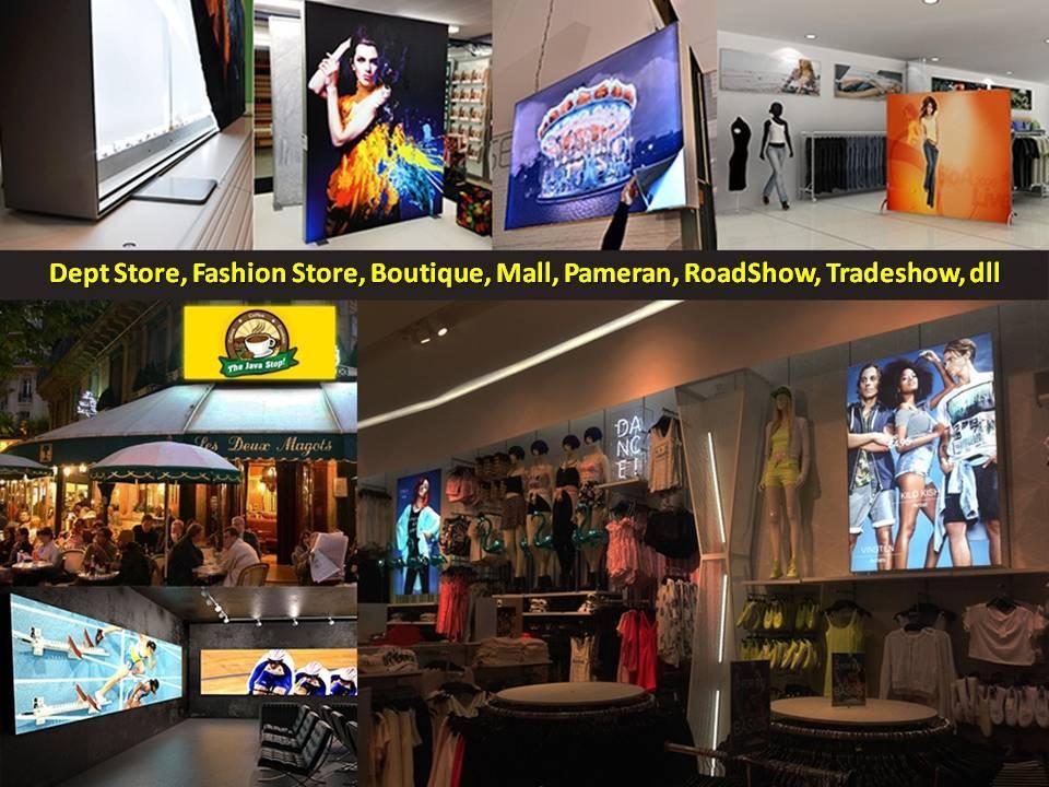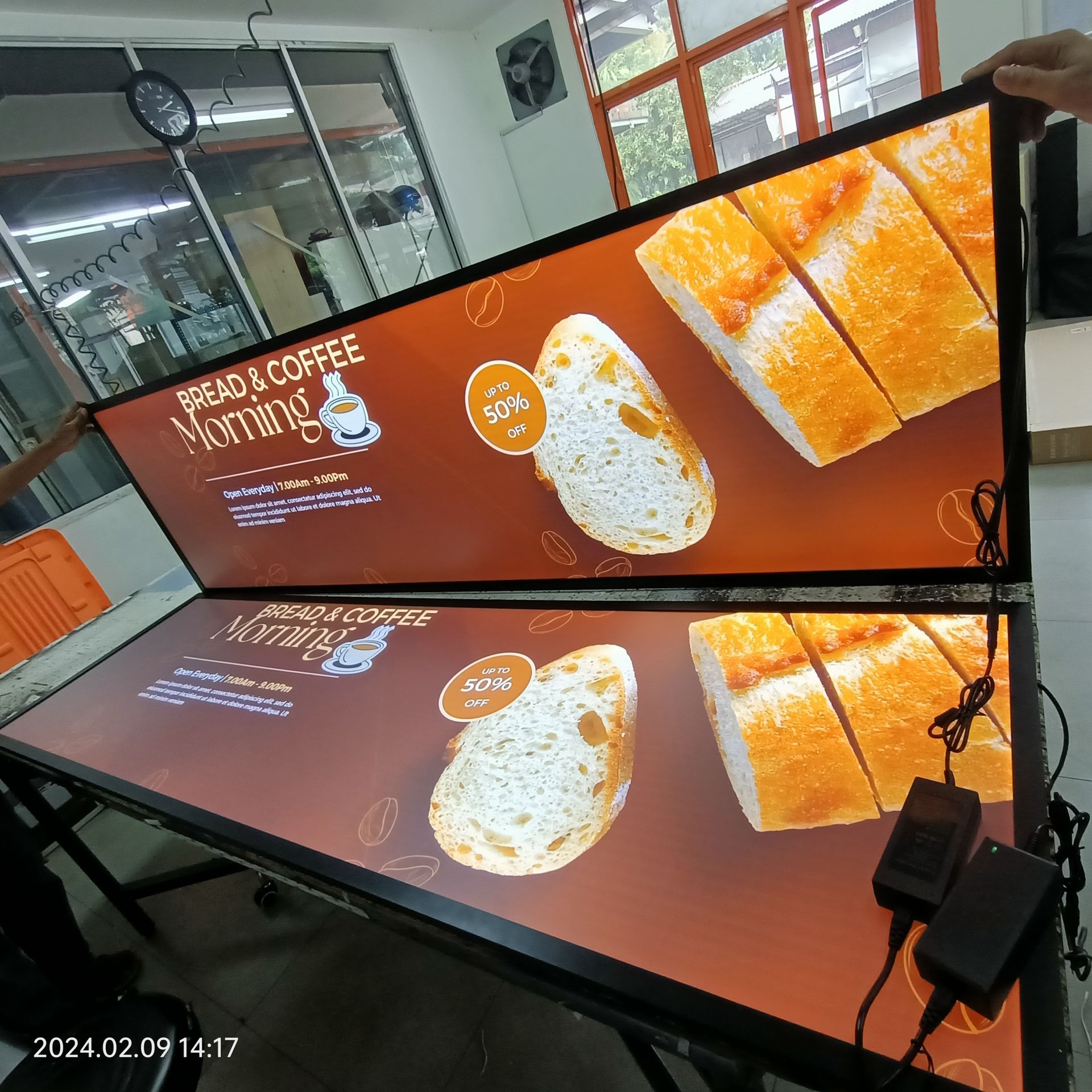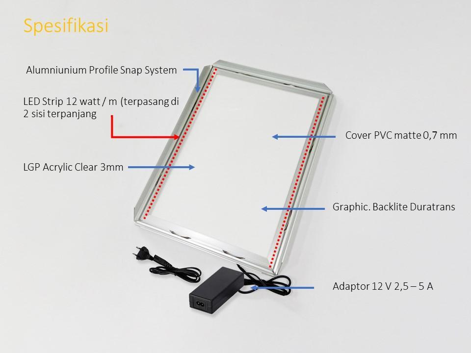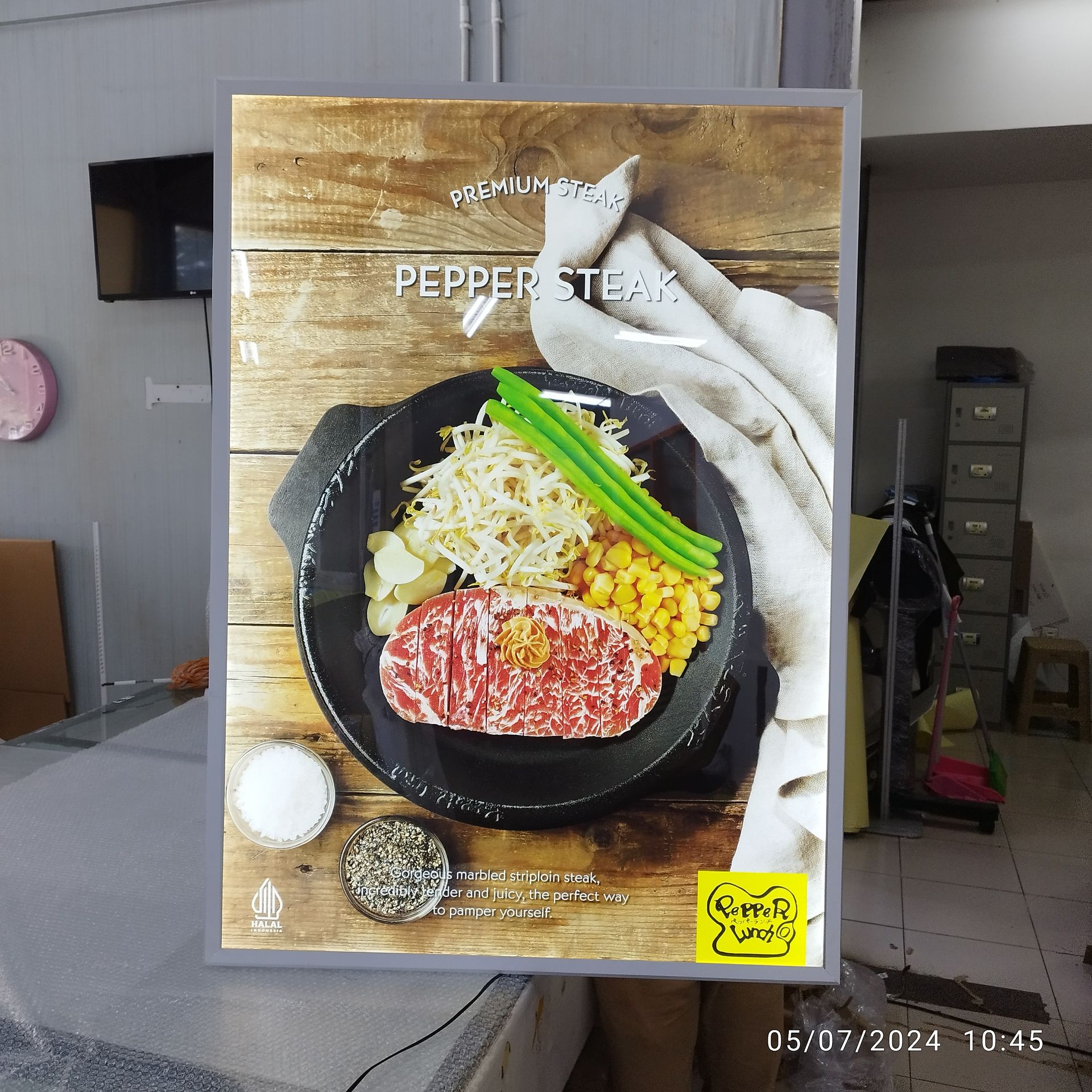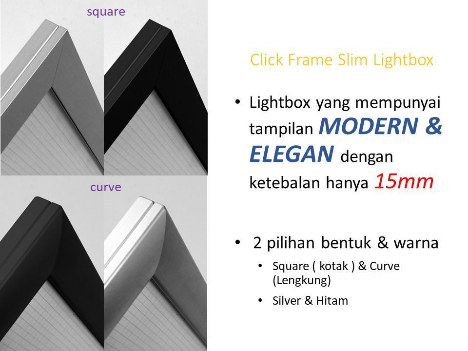 Lightbox tipis ketebalan cuma 1,5 cm dengan sistem Click/Snap sehingga mudah mengganti gambar. Mempunyai pilihan bentuk Frame. Square (Kotak) dan Curve (Lengkung) yang bisa disesuaikan dengan tampilan display yang Anda punya. Pilihan warna silver dan hitam powder coating, cat tidak mudah lecet. Menggunakan Lampu LED hemat energi.