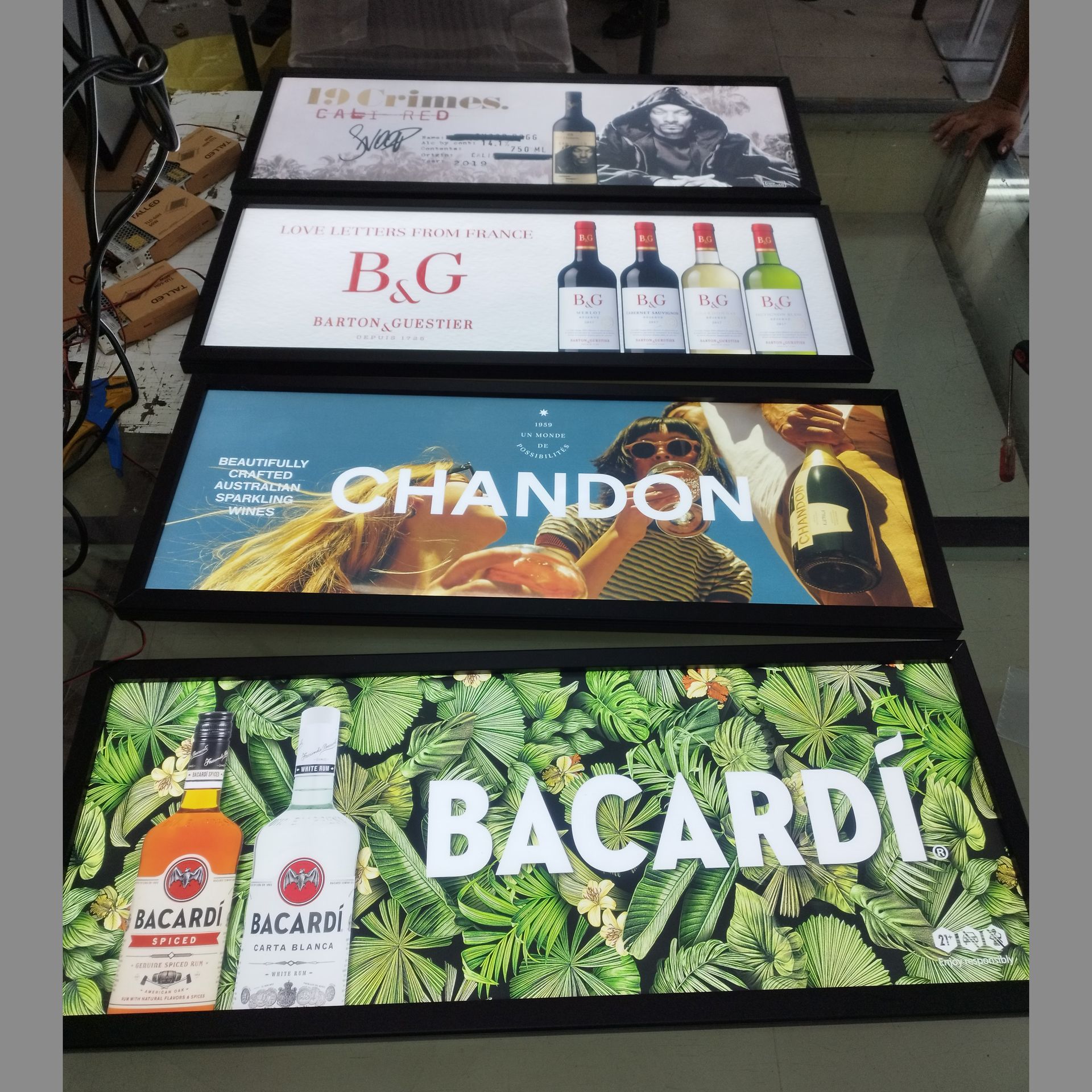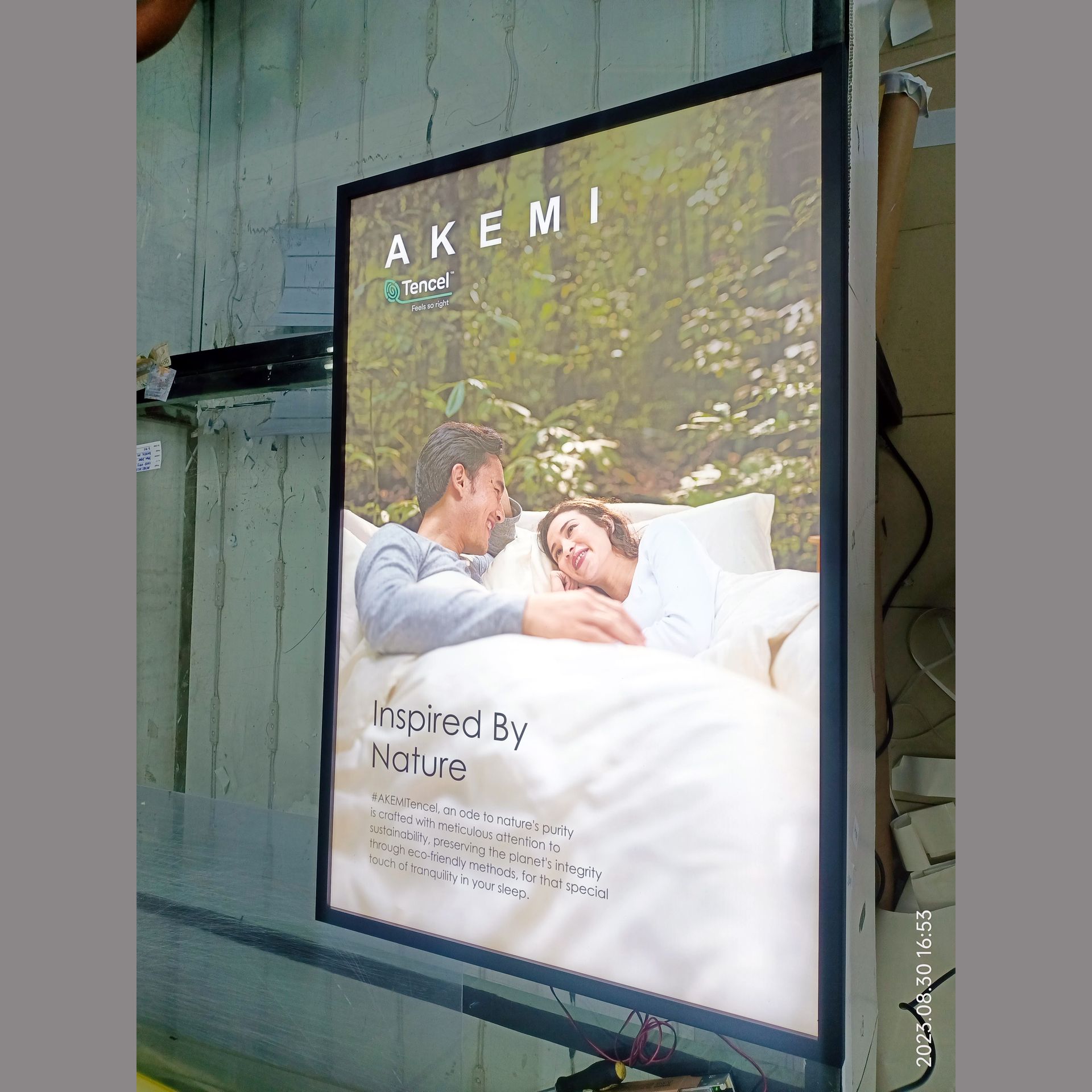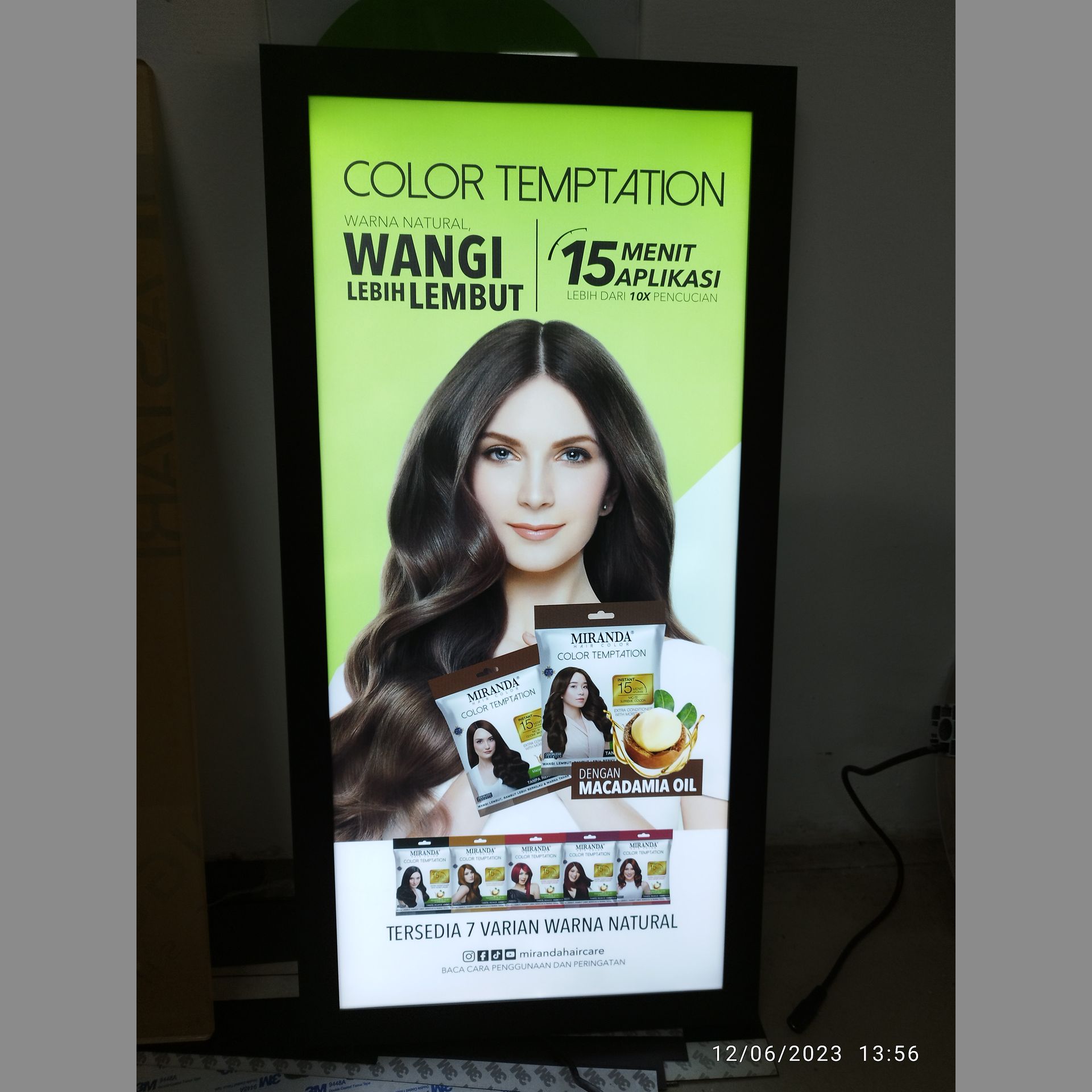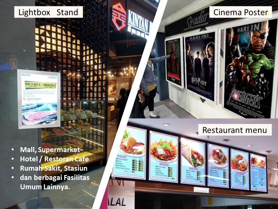 Lightbox tipis ketebalan cuma 1,5 cm dengan sistem Click/Snap sehingga mudah mengganti gambar. Mempunyai pilihan bentuk Frame. Square (Kotak) dan Curve (Lengkung) yang bisa disesuaikan dengan tampilan display yang Anda punya. Pilihan warna silver dan hitam powder coating, cat tidak mudah lecet. Menggunakan Lampu LED hemat energi.