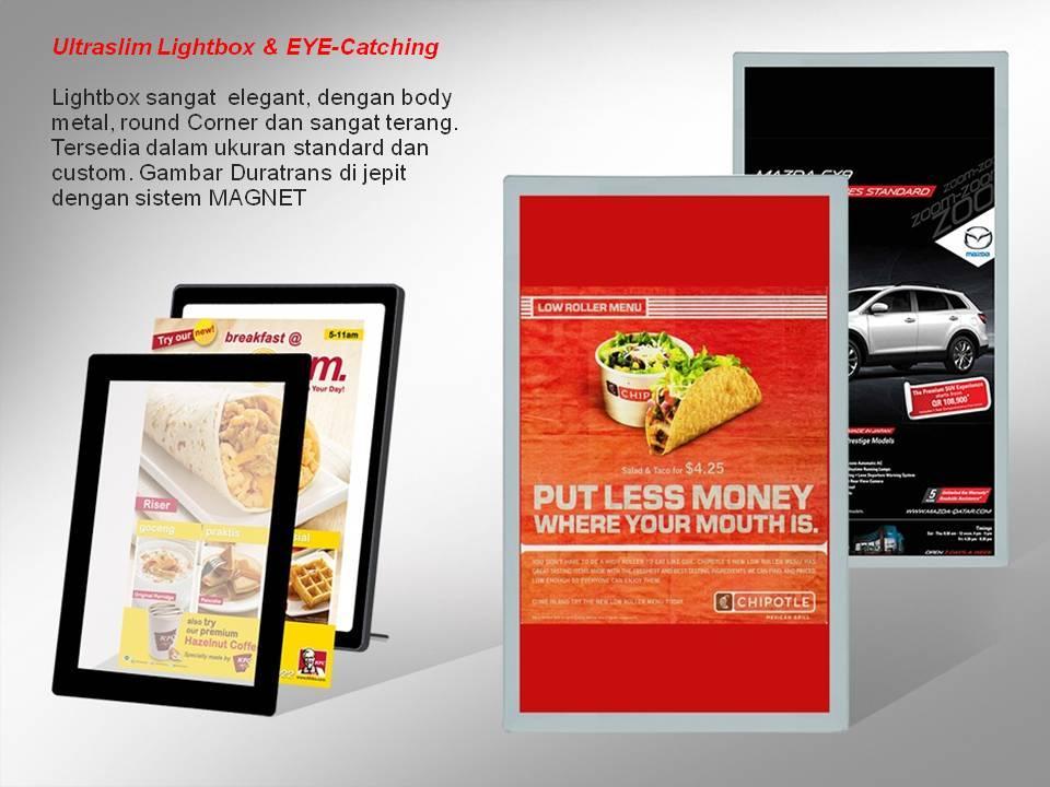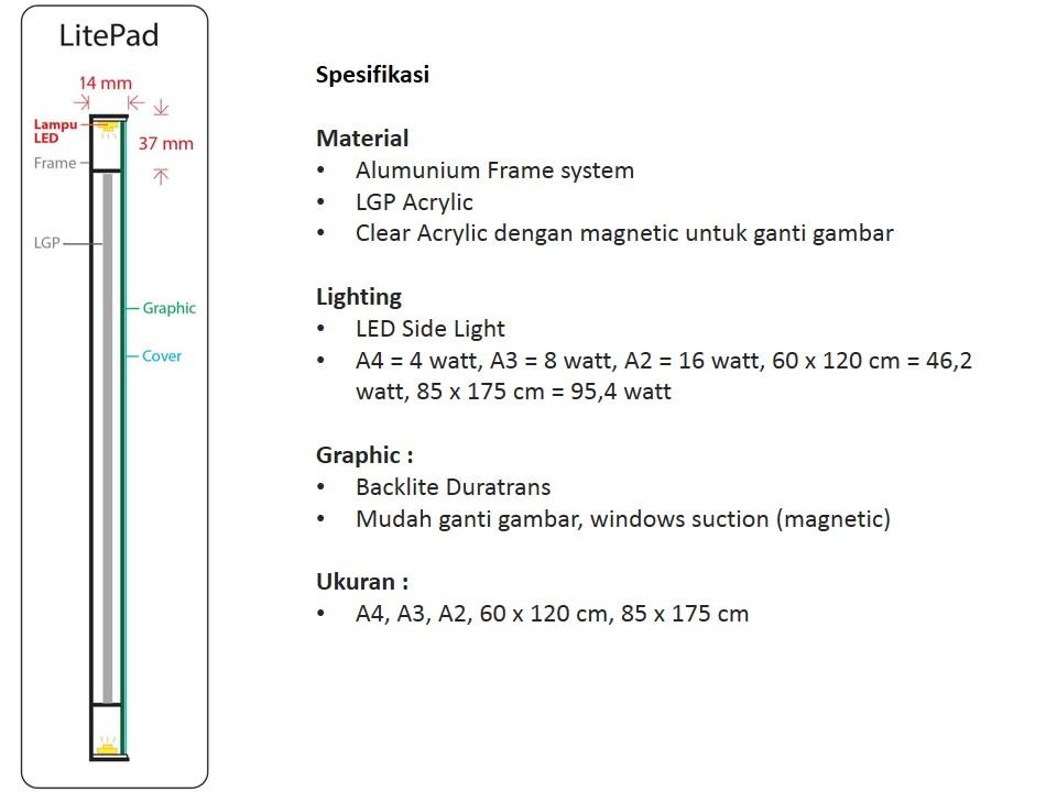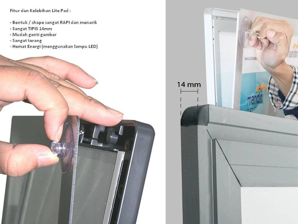 Lite Pad merupakan produk Lightbox Tipis (Tebal 15mm) dengan tampilan modern dan elegan.Frame Lite Pad terbuat dari alumunium membuat bingkai menjadi kokoh, kuat dan tahan lama.