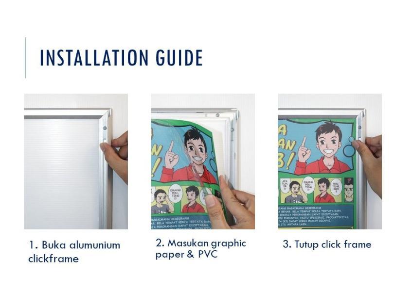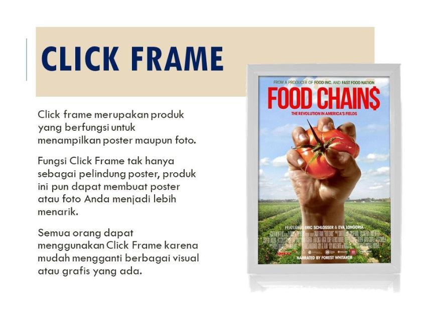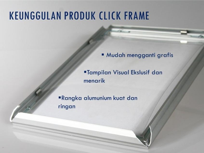 Click Frame merupakan produk yang berfungsi untuk menampilkan Poster maupun Foto sebagai figura dengan material Alumunium profile yang tidak karat. Semua orang dapat menggunakan Click Frame karena Anda dapat dengan mudah mengganti berbagai visual atau grafis yang ada tanpa alat bantu.