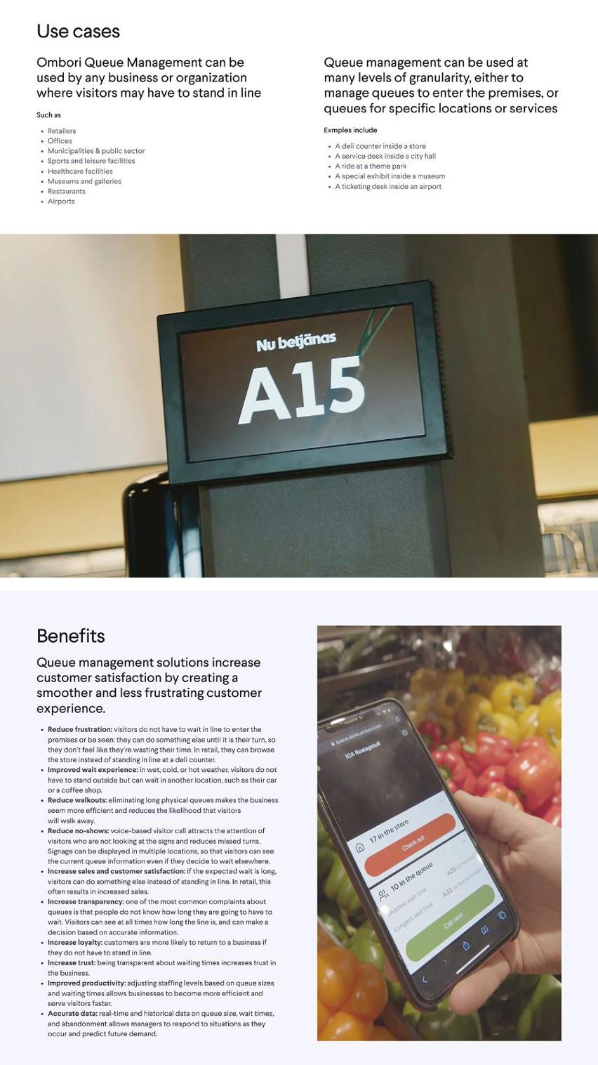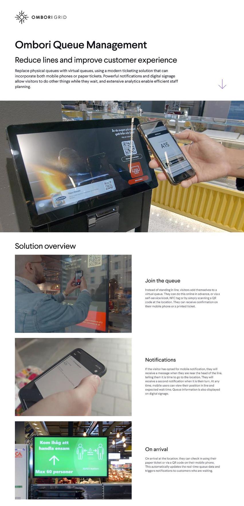 Replace physical queues with virtual queues, using a modern ticketing solution that can incorporate both mobile phones or paper tickets. Powerful notifications and digital signage allow visitors to do other things while they wait, and extensive analytics enable efficient staff planning. Combine with Appointment Booking, Occupancy Control, People Counter, Omni Visit and Digital Signage to create a full-featured visitor management solution.